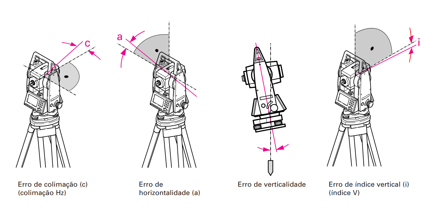 - c) Erro de verticalidade – Para o ângulo entre a linha de prumo e o eixo principal.