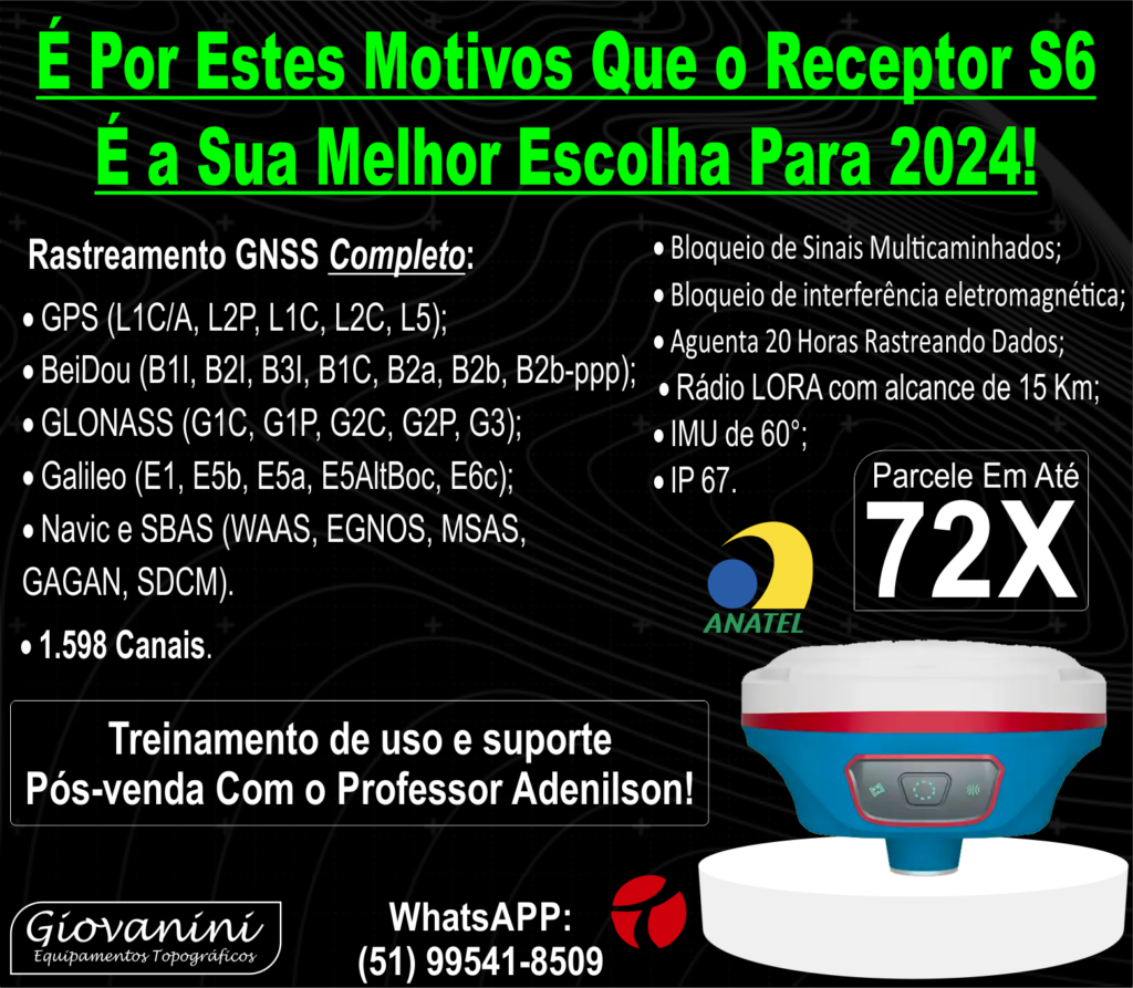 – Opção 3: valor das parcelas do kit RTK S6 + T30 laser + coletora de dados R60 + acessórios no parcelamento em 60 vezes sem juros: 6 parcelas de R$ 2.164,33 reais + 54 parcelas de R$ 1.340,35 reais.